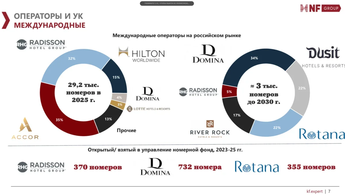 Среди международных игроков, которые сохраняют свое присутствие, наибольшая доля отелей находится под управлением Accor (35%). Почти столько же – у Raddison Hotel Group (32%). За ними следуют Hilton Worlwide (15%). Менее крупные доли занимают Domina (4%) и Lotte Hotels&Resorts (3%).