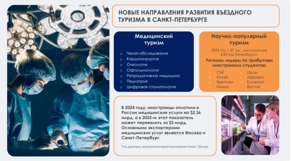 Она рассказала, что сейчас усилия Санкт-Петербурга наряду с развитием культурно-познавательного туризма направлены на медицинский и научно-популярный туризм.