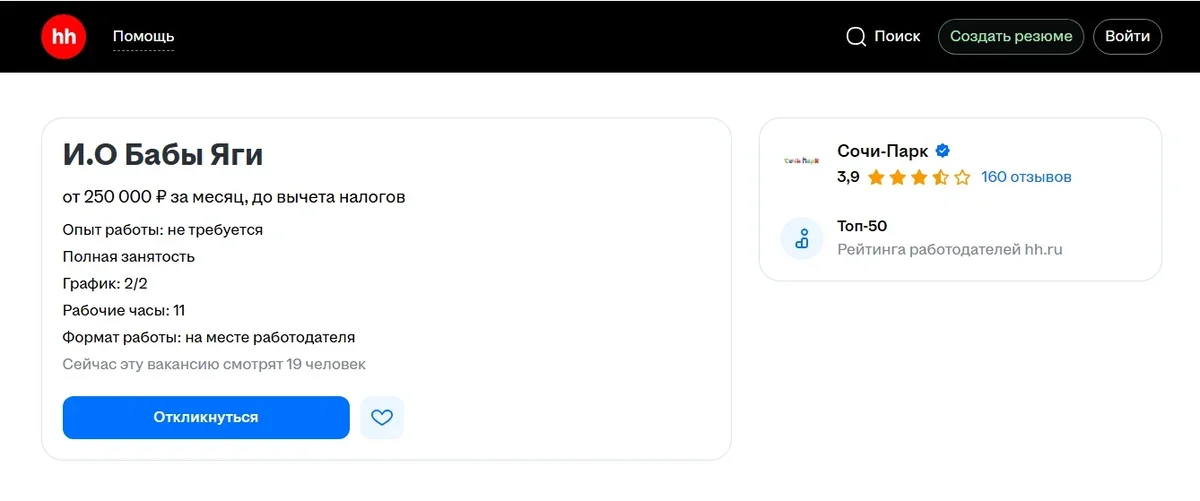 Вслед за «Мандрогами» в Ленобласти, где летом искали барина, «Сочи Парк», открыл вакансию исполняющего обязанности Бабы Яги с доходом от 250 тыс. руб. в месяц до вычета налогов и официальным оформлением.