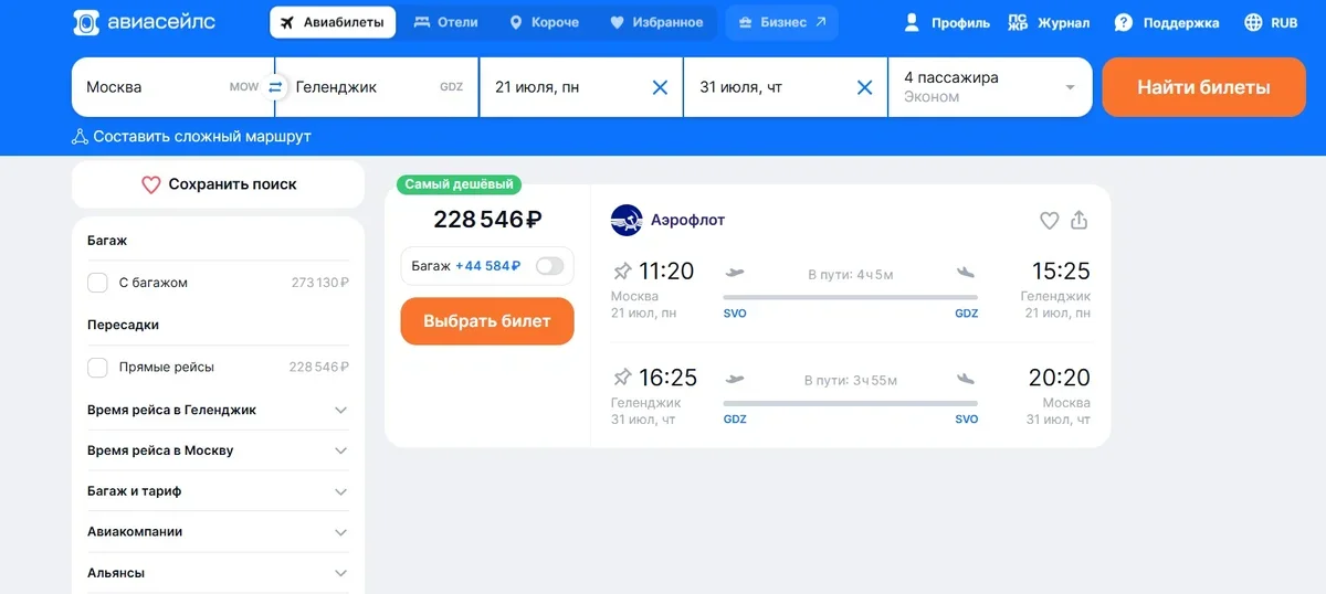 В Анапу через Геленджик: только авиабилеты для 2 взрослых и 2 детей 8 и 12 лет из Москвы в Геленджик и обратно на рейсах «Аэрофлота» обойдутся в 228 546 рублей. И это без багажа. С двумя местами багажа – 250 838 рублей. Плюс такси – 5 360 рублей в Яндекс.Go туда и обратно.