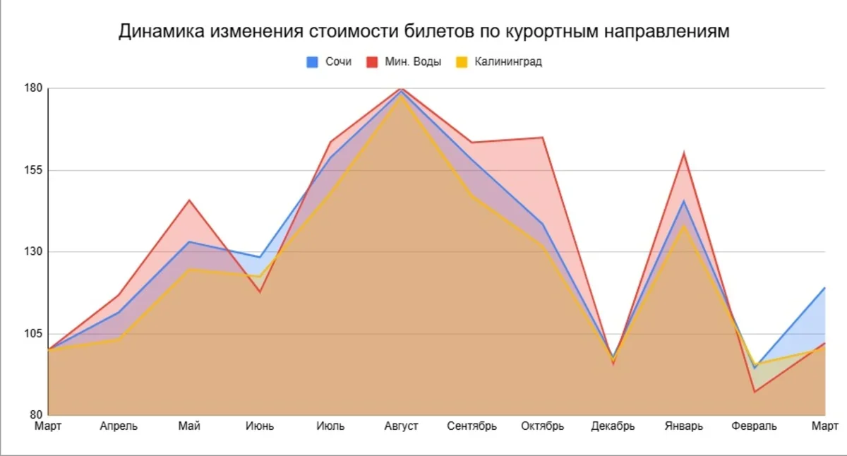 Драйвером роста цен стали курортные и дальние маршруты, а также тарифы более дорогих групп. Взрывной рост цен показали направления с выраженной сезонностью: Сочи, Минеральные Воды и Калининград. Летом стоимость подскакивала в 1,8–2,5 раза по сравнению с весной, а потом «откатывалась» к «норме».