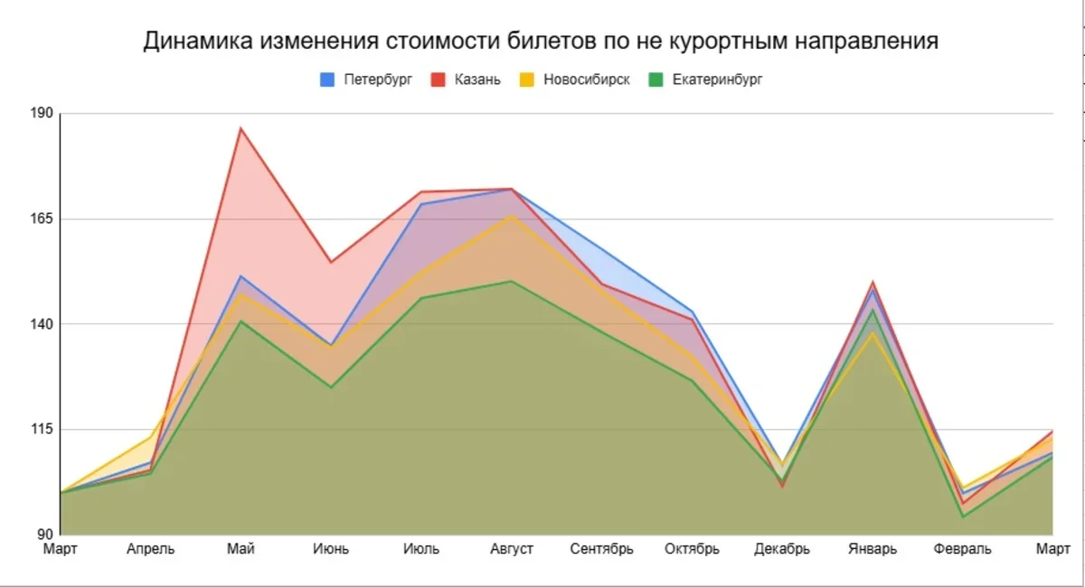 И в-четвертых, красивые пики на графике выше вызваны преимущественно колебаниями цен на билеты по курортным направлениям. Остальные города – это совсем другая история.