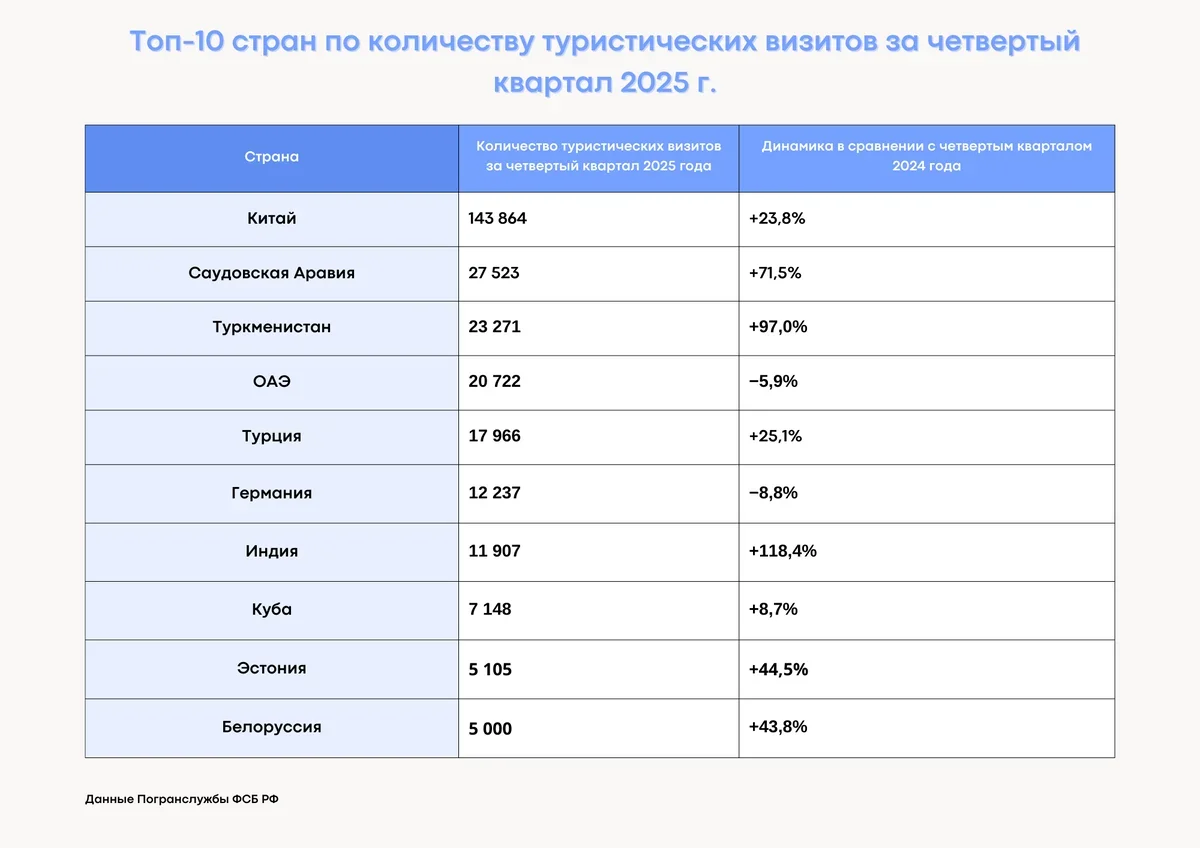 Драйверами же прироста иностранного турпотока (но со значительно более низкой, чем у Китая, базой) в 2025 году стали: Саудовская Аравия, Туркменистан, Турция, Белоруссия, Индия, Оман и Кувейт. Весь чистый прирост объемов (плюс более 70,5 тыс.) пришелся именно на эти семь направлений.
