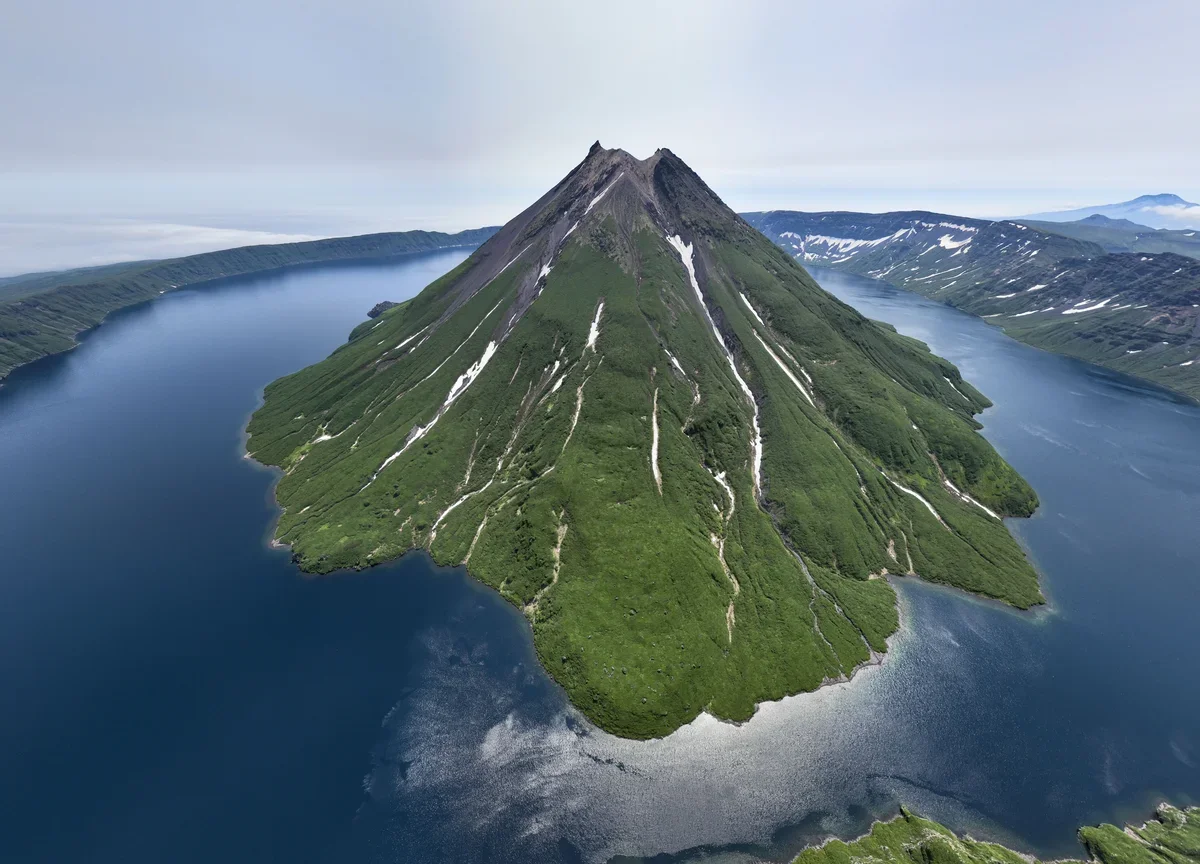 Гигантская кальдера диаметром 17 км заполнена озером, а прямо из него вырастает идеально симметричный вулканический конус. Это необычное зрелище называют «вулканом в вулкане». Чтобы увидеть этот фантастический пейзаж, включенный в список «100 чудес России», придется пройти 15 км пешком (в обе стороны) с набором высоты 600 м.