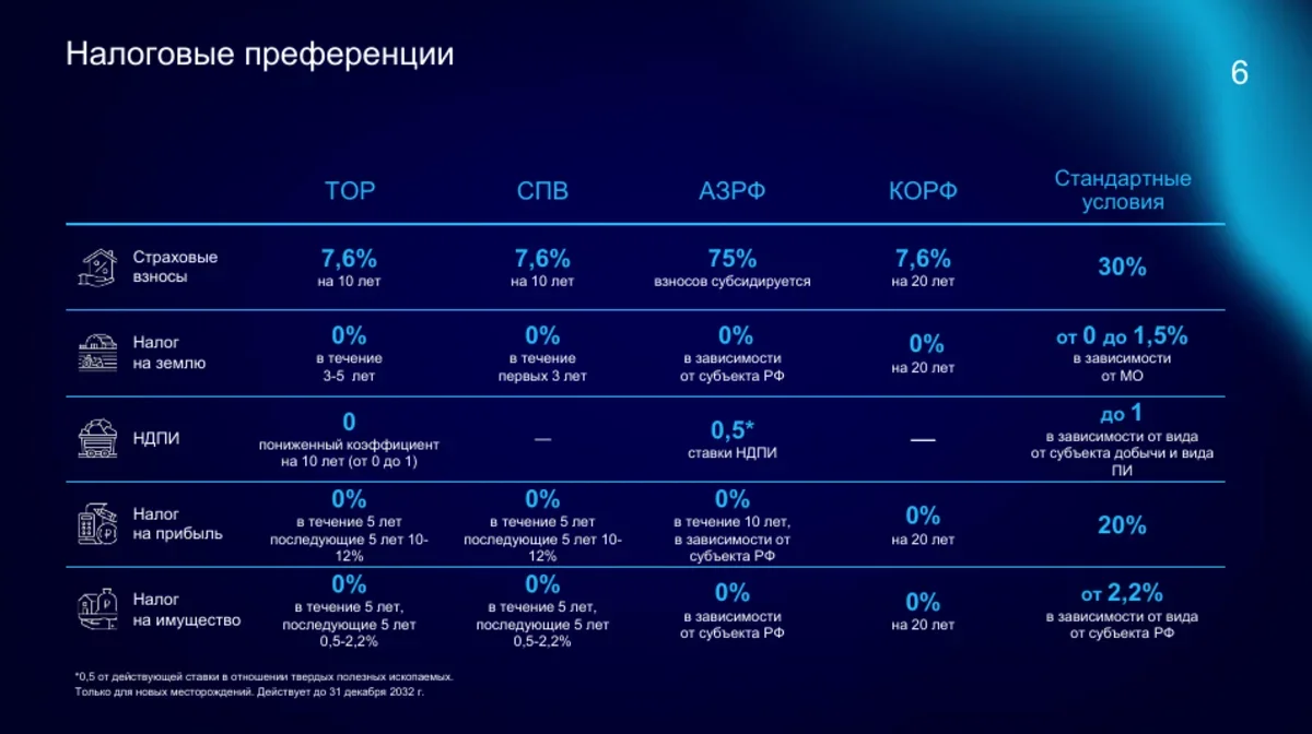 В Арктической зоне нулевая ставка налога на прибыль действует до десяти лет, а государство компенсирует 75% затрат на страховые взносы.
