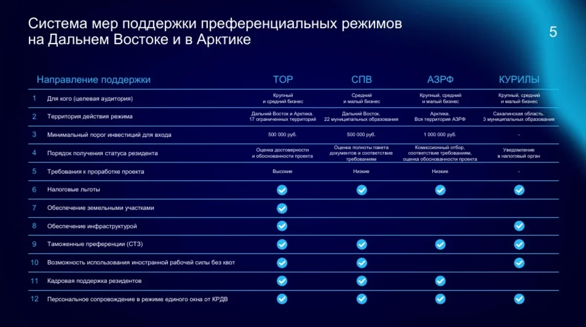 Корпорация развития Дальнего Востока и Арктики (КРДВ) выступает единым оператором четырёх ключевых преференциальных режимов: Территорий опережающего развития (ТОР), Свободного порта Владивосток (СПВ), Арктической зоны РФ (АЗРФ) и специального режима для Курильских островов (КОРФ).
