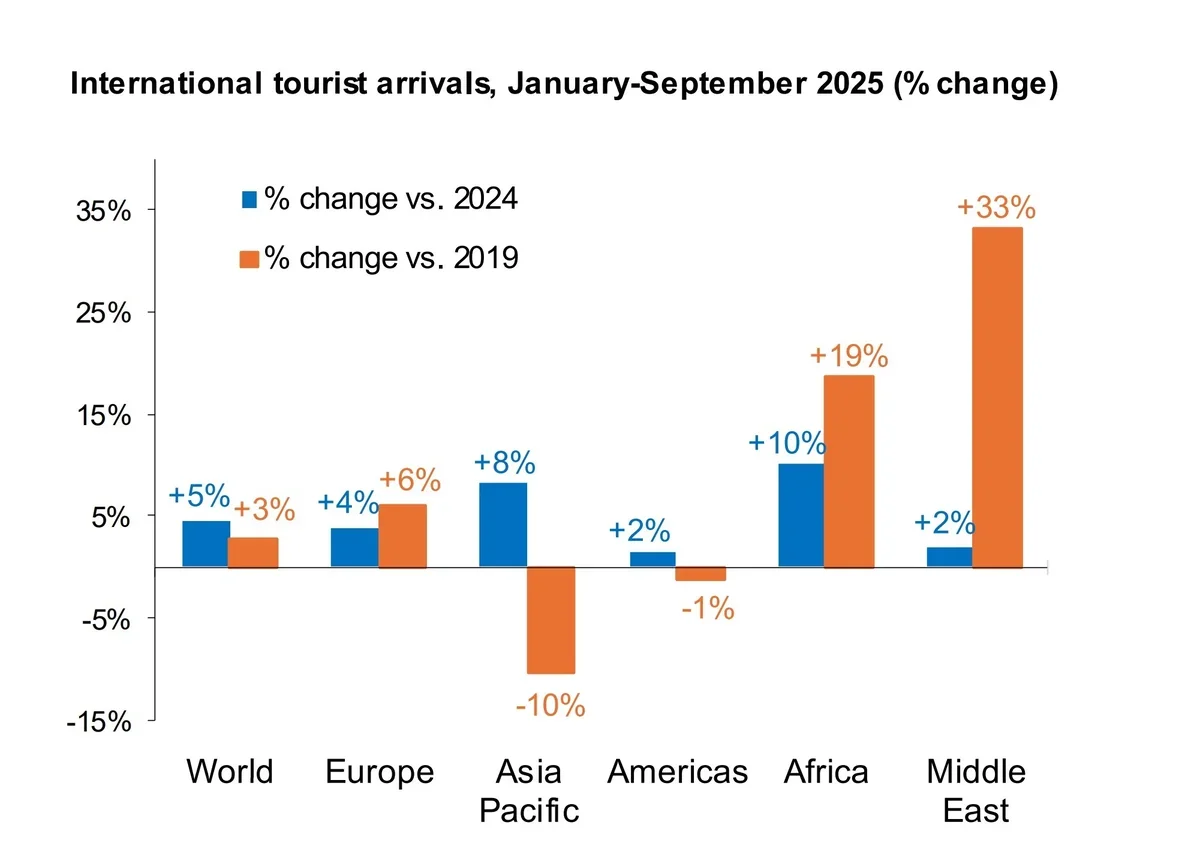 На Ближнем Востоке количество международных прибытий в январе–сентябре 2025 года выросло на 2% по сравнению с аналогичным периодом 2024 года и на 33% превысило уровень 2019 года, что является самым высоким региональным показателем восстановления по сравнению с допандемийным периодом.