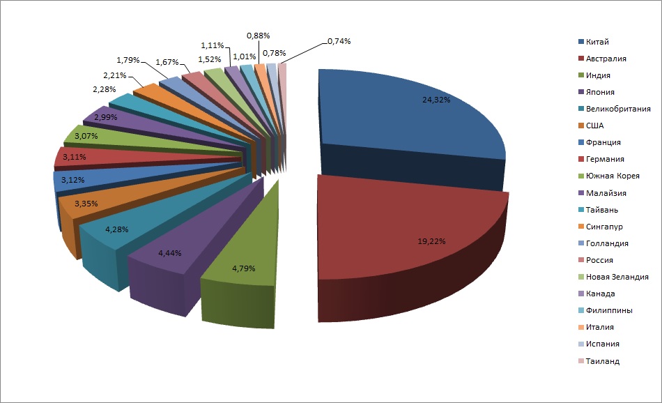 Рис. 1. Доли стран в иностранном турпотоке на Бали по итогам 2017 года.