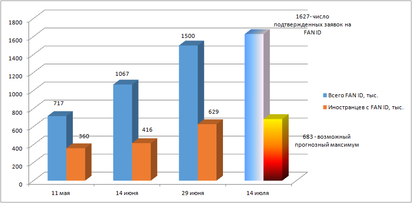 По самым последним официальным данным оргкомитета «Россия-2018», опубликованным 15 июля на его странице, всего болельщикам было выдано 1,5 млн FAN ID. Эти же данные озвучивались 29 июня Оргкомитетом «Россия-2018»: «по итогам группового этапа россиянам и иностранцам было выдано 1,5 млн паспортов болельщика, а подтверждено заявок на них – 1,627 миллиона». Исходя из того, что россияне из 1,5 млн паспортов болельщика получили 871 тыс., иностранцам достались 629 тысяч FAN ID.