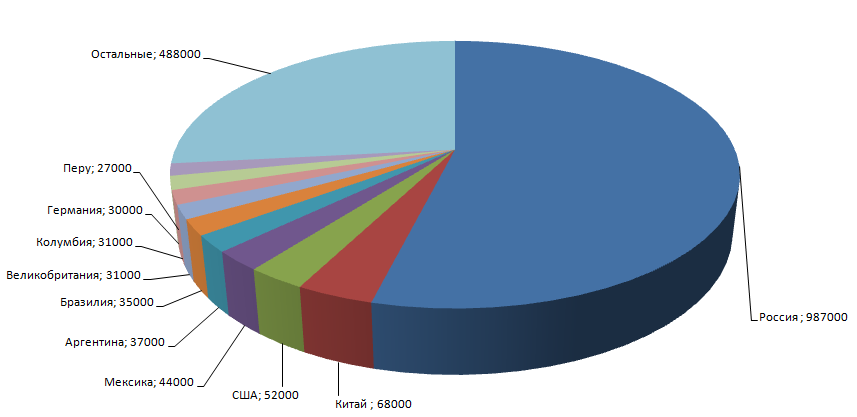 Рис. 1. Распределение долей болельщиков по странам с учетом России (тыс. FAN ID).