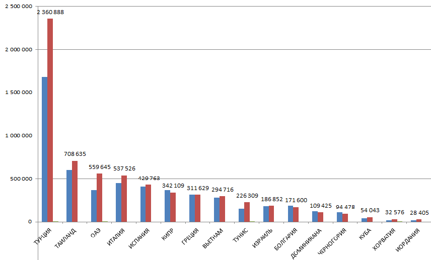 Результаты I полугодия по ТОП-15 пляжным направлениям «дальнего» зарубежья в абсолютных показателях можно посмотреть на рис. 1.