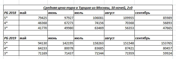 Рис.1. Средние цены туров в Турцию (10 ночей, 2 взрослых) в декабре 2018/январе 2019 г. с заездами в мае-сентябре 2019 года.