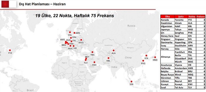 Это, в том числе, Казахстан (Алмааты), Белоруссия (Минск), Грузия (Тбилиси). Также в графике полетов THY – Канада, Афганистан, Япония, Южная Корея, КНР, Сингапур, Дания, Швеция, Норвегия, Австрия, Нидерланды, Бельгия, Ливан, Кувейт и Израиль.