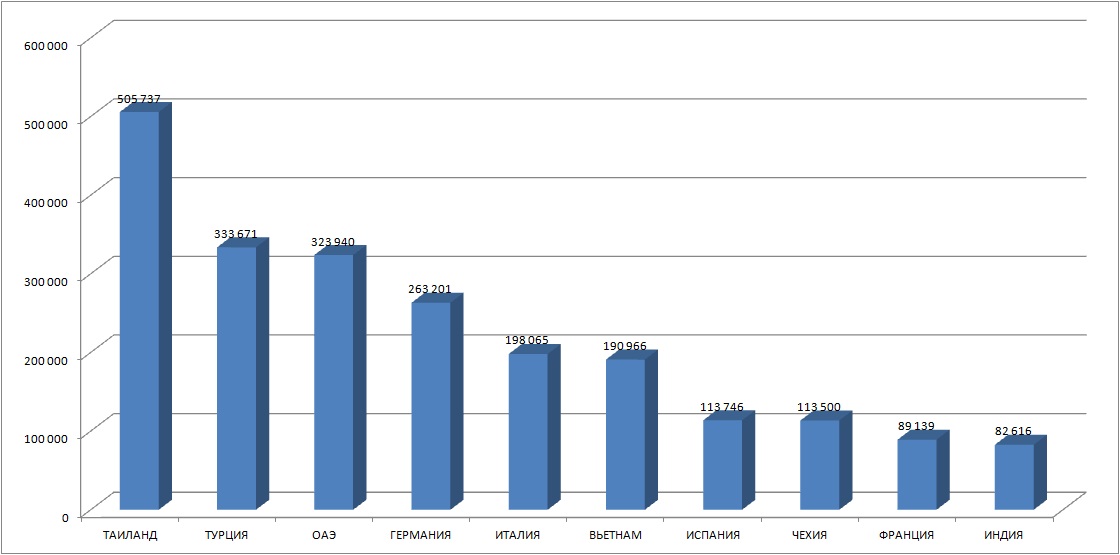 По абсолютному количеству поездок в «общем зачете» (поездки с различными целями, для ряда стран – не туристическими) в десятку лидеров по выезду вошли Абхазия (814 925 поездок), Финляндия (813 711), Украина (568 682), Казахстан (532 002), Таиланд (505 737), Эстония (394 912), Турция (333 671), ОАЭ (323 940) и Германия (263 201).