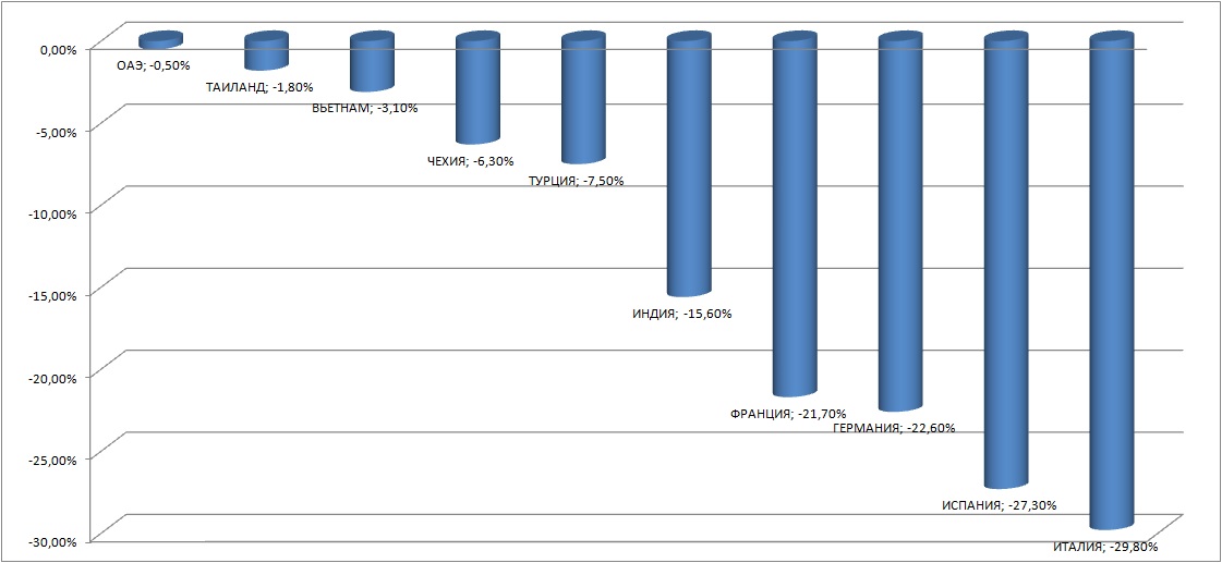 Рис. 2. Динамика падения турпотока из РФ в десятке стран-лидеров.