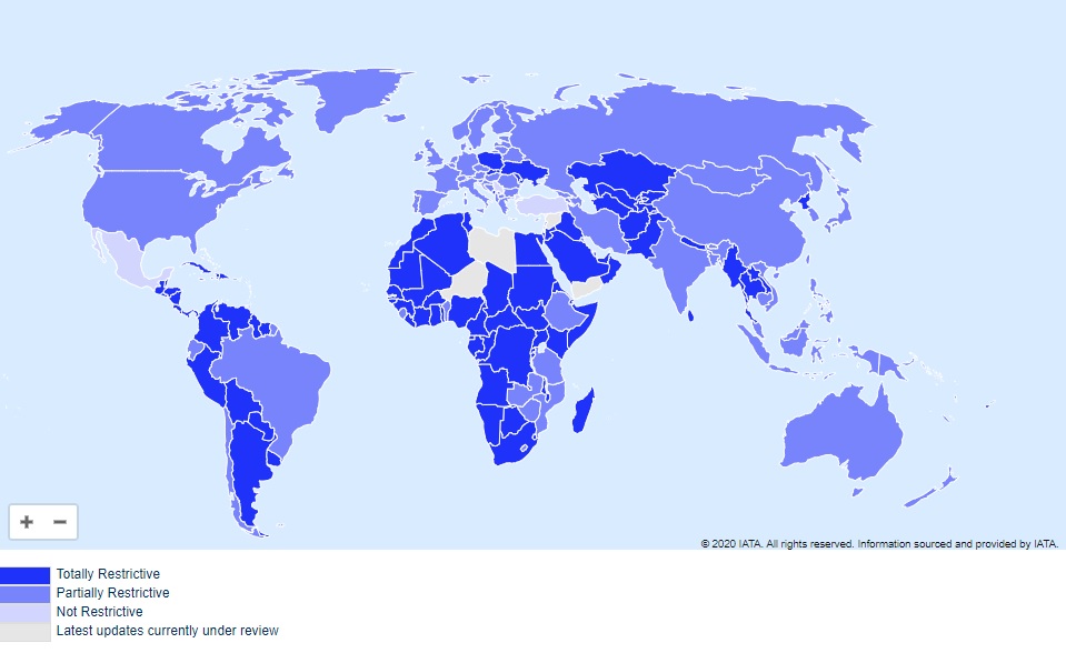 IATA опубликовала составленную на основе данных отраслевого справочника Timatic интерактивную карту мира, где показано, какая степень ограничений международного авиасообщения действует на настоящий момент в той или иной стране.