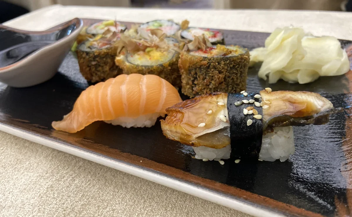 Каждому гостю вручили фирменную маску и пакет с информационными материалами. Все приглашенные были рассажены по одному за столики: вместо привычного допандемийного буфета всех ждала персональная подача японских блюд и десертов.