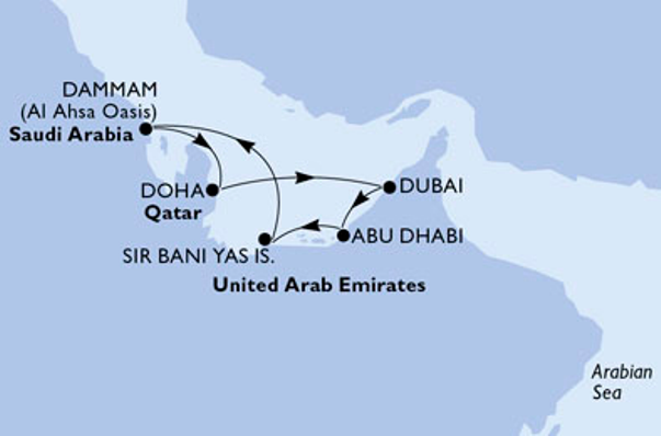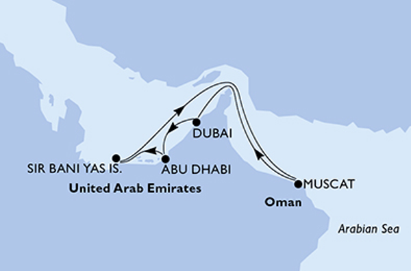 Оба путешествия, продолжительностью 7 ночей, начинаются преимущественно из порта Дубая и предполагают в нем как минимум двухдневную стоянку. Помимо Дубая они также заходят в столицу ОАЭ Абу-Даби и на Сир-Бани-Яс – удивительный остров, который благодаря системе искусственного полива был превращен в настоящий оазис с пышной растительностью и редкими или даже исчезающими видами диких животных.