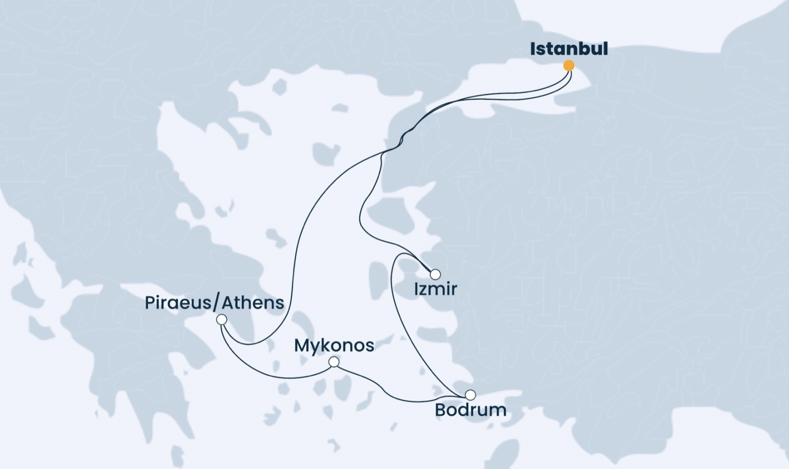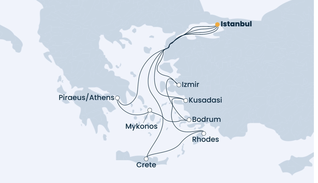 Маршрут: Стамбул (2 дня) – Измир (7 часов) – Бодрум (10 часов) – о. Миконос (11 часов) – Афины (11 часов) – день в море – утреннее прибытие в Стамбул.