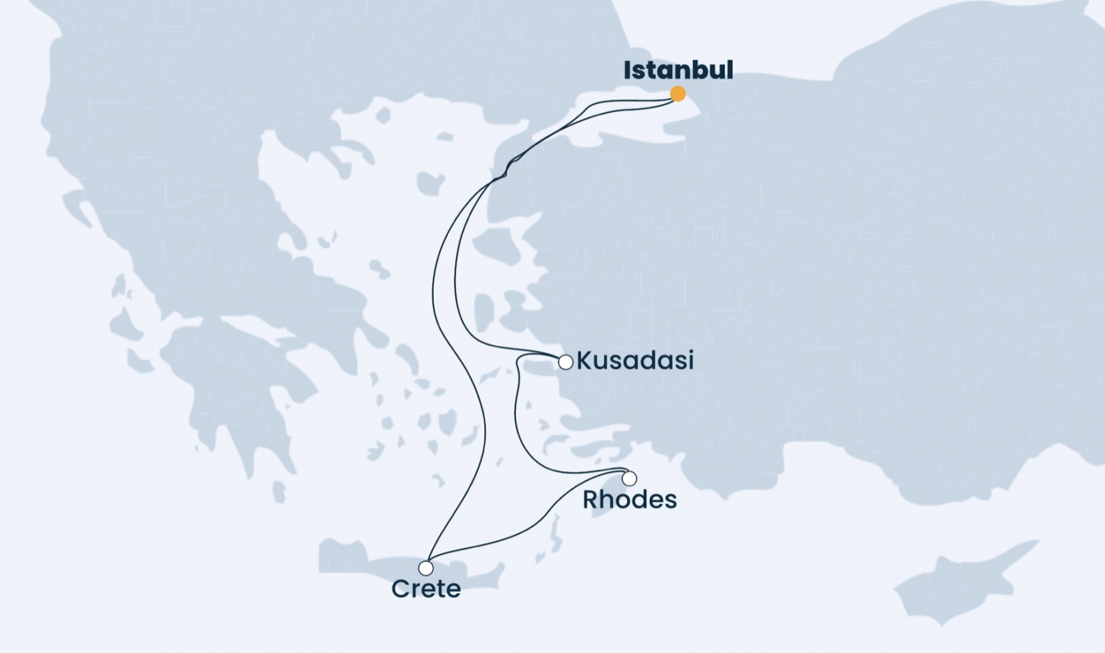 Маршрут: Стамбул (2 дня) – Кушадасы (2 дня) – о. Родос (11 часов) – о. Крит (11 часов) –день в море – Стамбул (2 дня) – Измир (7 часов) – Бодрум – (10 часов) – о. Миконос (11 часов) –Афины (11 часов) – день в море – утреннее прибытие в Стамбул.