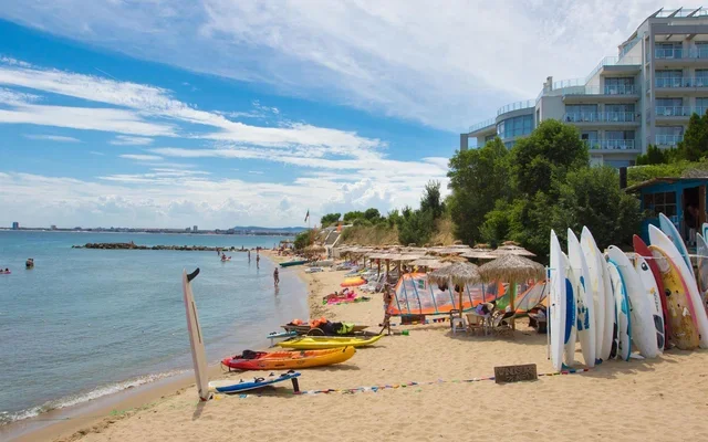 Собственный песчано-галечный оборудованный (лежаки и зонты) пляж находится в 100 метрах от корпусов. На нем к услугам отдыхающих гидроциклы, катамараны, прогулочные лодки, водные аттракционы. На пляже есть и пляжный бар с неплохим ассортиментом напитков и блюд.