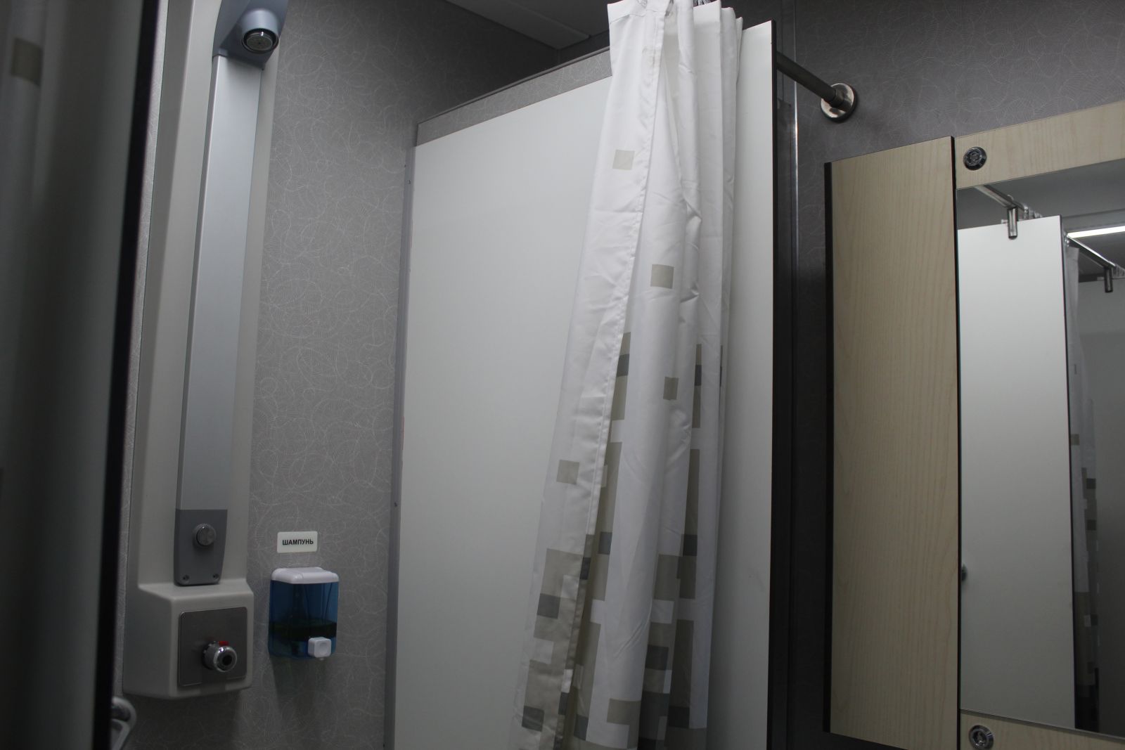 Вагон разделен на мужские и женские секции, в них все удобно: душевые кабины, моющие средства, вешалки для одежды и полотенец, полочки для вещей.