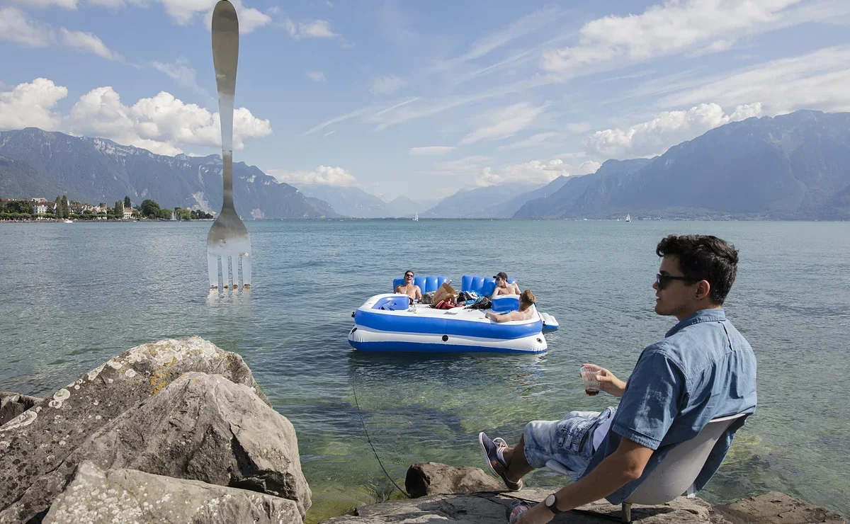 Памятник вилке в Женевском озере в городе Веве установила в 1995 году компания Nestle (там находится её штаб-квартира). Инсталляция должна была простоять всего год, но нет ничего более постоянного, чем что-либо временное. Вилка и ныне там (фото на обложке, выше).