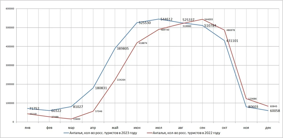 Восстановление после провала первой половины 2022 года (превышение над показателями 2022 года) в Анталье идет до августа. А с сентября прироста турпотока в годовом выражении уже нет из-за высокой базы сравнения в 2022 году, т.е. он нормализуется.