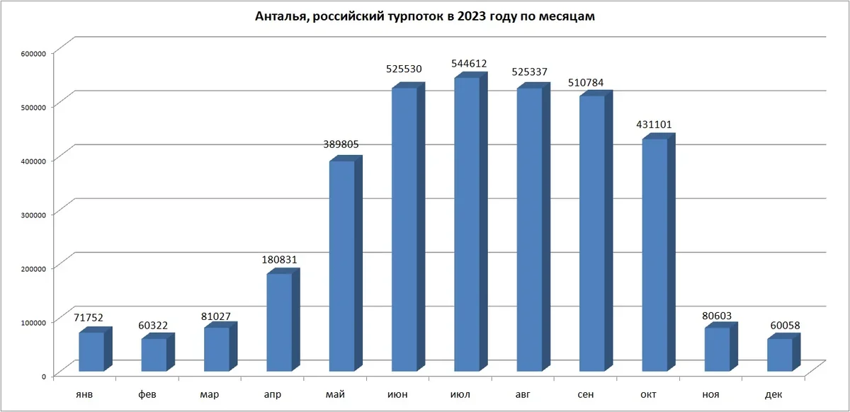На долю курортов провинции Анталья в 2023 году пришлось 54,8% всего российского турпотока в Турцию (3 461 762 визита россиян). Турпоток из РФ в Анталью по сравнению с 2022 годом прирос на 14,1%. Пик российских прибытий – с июня по сентябрь. Максимум поездок дал июль.