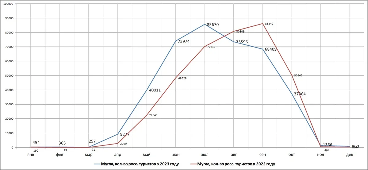 По сравнению с 2022 годом в Мугле также видно восстановление объемов в первой половине года и некоторый спад начиная с августа-сентября.