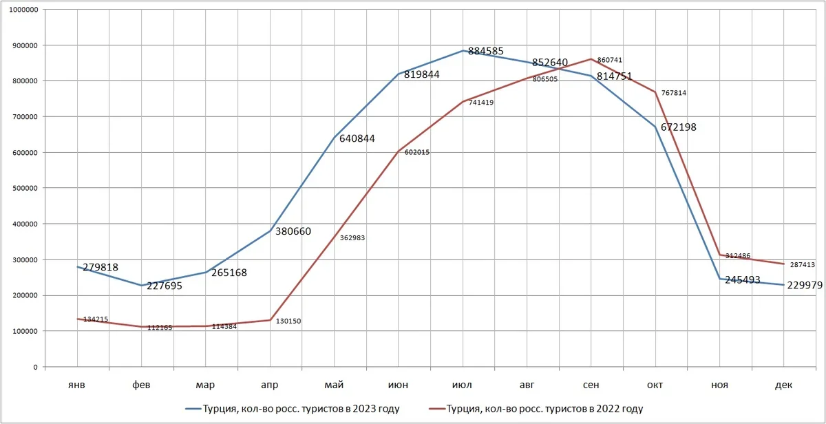 Начиная с сентября 2023 года (см. график ниже) превышения над цифрами 2022 года в российском турпотоке в Турцию уже не наблюдается.