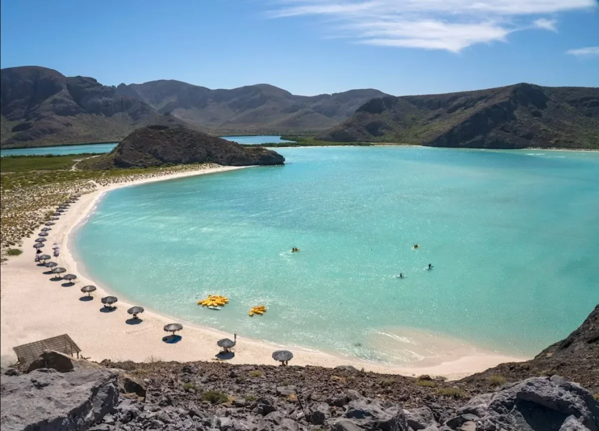 Баландра, Ла-Пас, Мексика (Playa Balandra). Он «спрятан» в защищенной бухте и идеально подходит для детей. Вход в море пологий, мелко и вода хорошо прогревается у берега. Помимо плавания, здесь можно взять напрокат каяки и доски для серфинга.