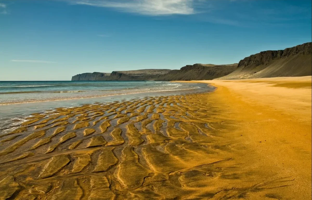 Раудасандур, Вестфьордс, Исландия (Rauðasandur). Это дикое побережье протяженностью 10 км с захватывающими дух скалами и бирюзовой лагуной, усыпано красным, оранжевым и розовым песком. Такую необычную палитру «создают» измельченные раковины морских гребешков. Компанию малочисленным туристам, которые не рискуют купаться, могут составить морские тюлени, резвящиеся на берегу.
