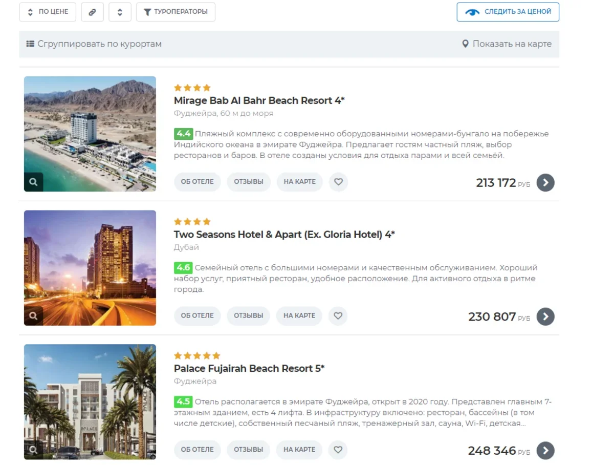 В списке оказались несколько туров с отелями 4 звезды в самом Дубае и его окрестностях, 5-звездочные отели в городе Эль-Айн, что в 120 км от Дубая, и в эмирате Фуджейра. Все эти предложения отвечали запланированному на отдых бюджету – от 180 до 250 тысяч рублей.
