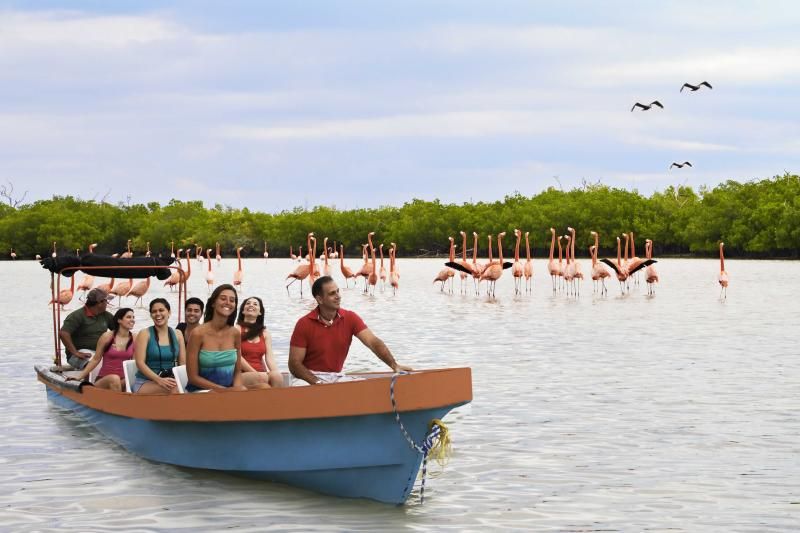 После фотосессии на самих озерах едем на экскурсию по джунглям – на катере по реке среди мангровых зарослей. Самое время для фотоохоты и бурных эмоций: увидим в живой природе и крокодилов, и пеликанов, и розовых фламинго, и другую экзотическую живность, в том числе и подводную. Экотур заканчивается на берегу Мексиканского залива, где можно покупаться и заодно пообедать.