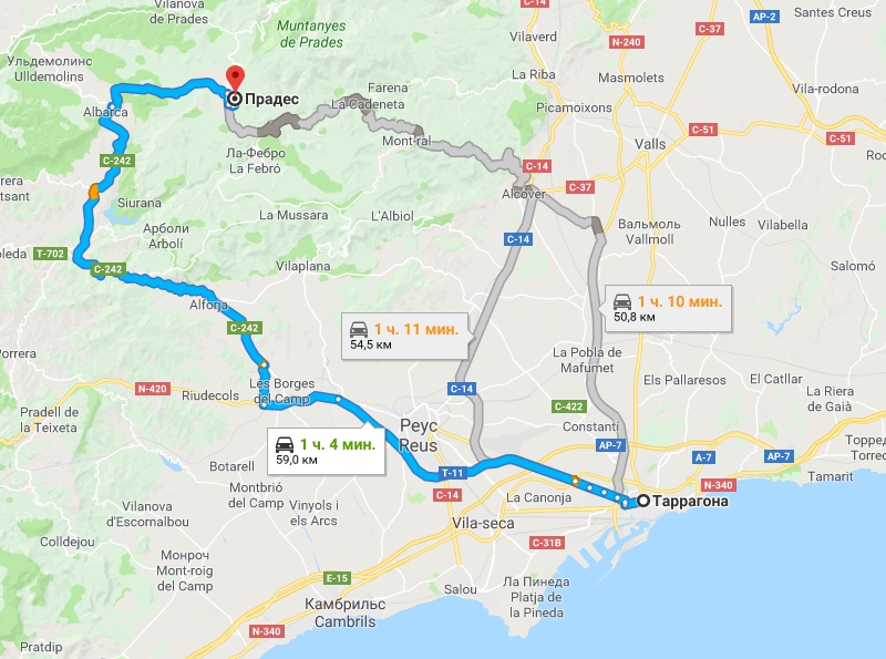 На машине надо проехать по шоссе AP-7 Barcelona-València, свернуть на съезде в город Реус, а затем проехать по дороге N-420 к Фальсету. После указателя на Les Borges del Camp мы сворачиваем на дорогу C-242 в направлении Прадеса.