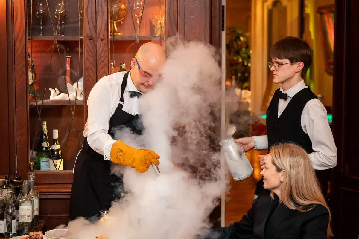 Исторический экскурс на тему «Петровских ассамблей» сопровождал подачу эксклюзивных блюд и напитков, часть из которых готовилась и сервировалась прямо в зале. Теплая, уютная атмосфера ресторана и интеллектуальная презентация искусствоведа и сомелье погрузили директоров агентств в атмосферу петровского времени.