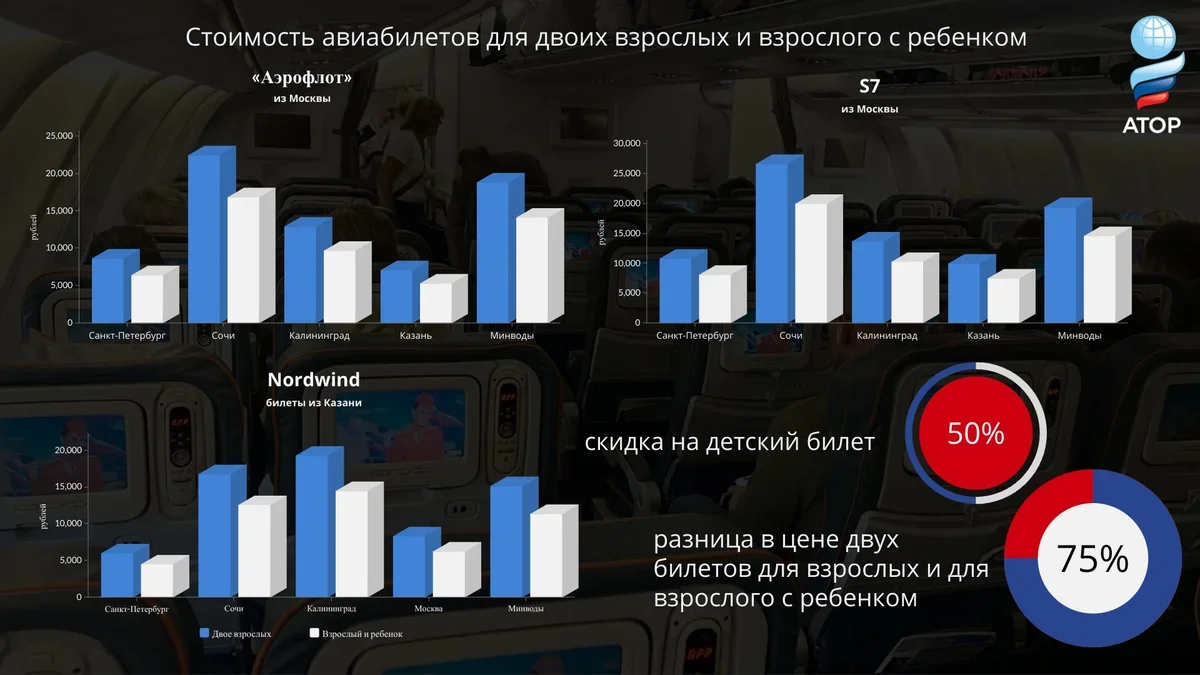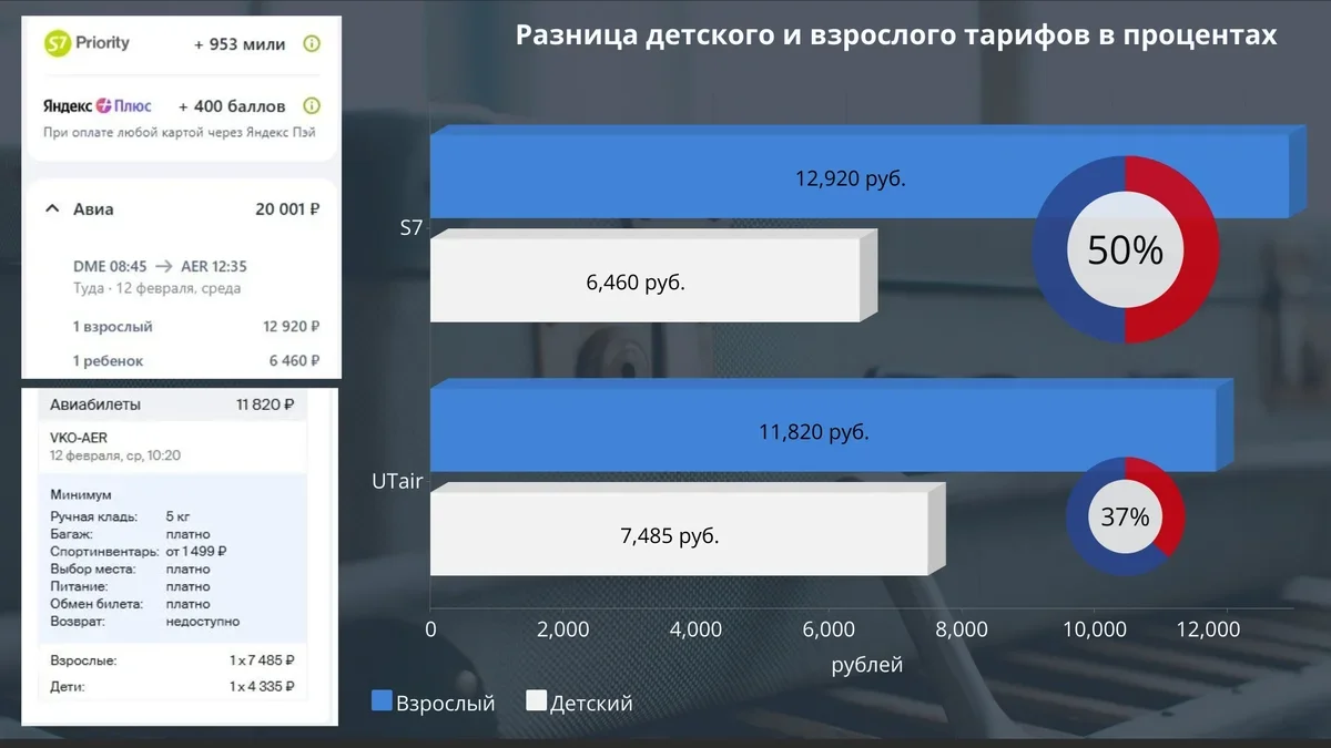 У компаний S7 и UTair легко выделить детский тариф в общей стоимости билета – эта информация отображается на сайте при покупке. Но так не у всех перевозчиков, поэтому мы брали стоимость двух взрослых билетов и сравнивали со стоимостью билета на взрослого и ребенка. Соответственно, если во втором случае билеты обходились на 25% дешевле, значит скидка на детский билет – действительно 50%.