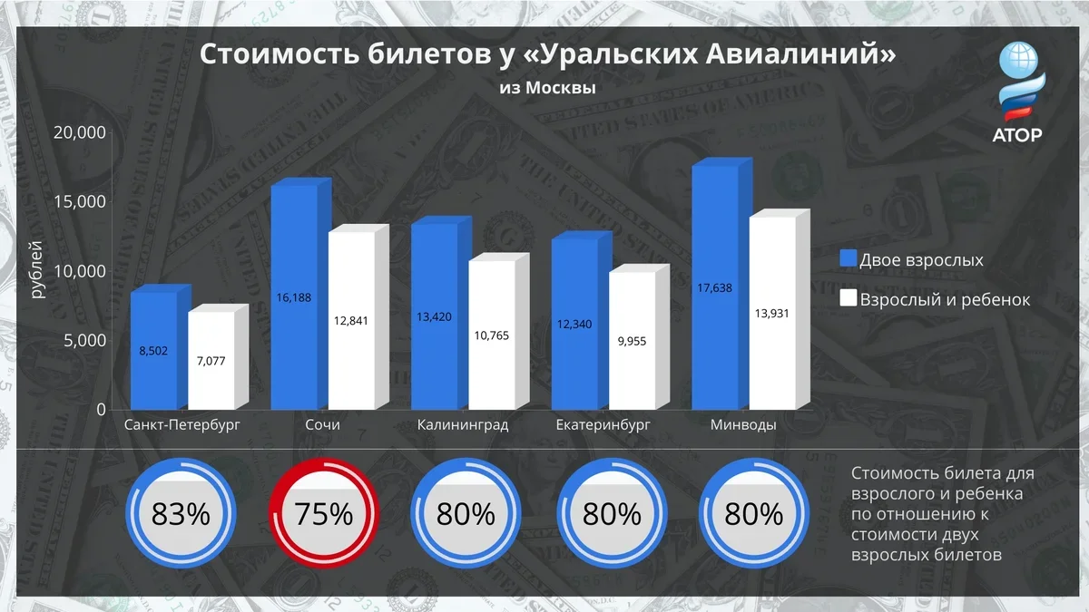В результате проведенного мониторинга мы убедились, что в 70% случаев детский билет действительно обходится ровно в два раза дешевле, чем взрослый. Соответственно, стоимость перелета для взрослого и ребенка составляет ровно 75% от стоимости перелета для двоих взрослых.