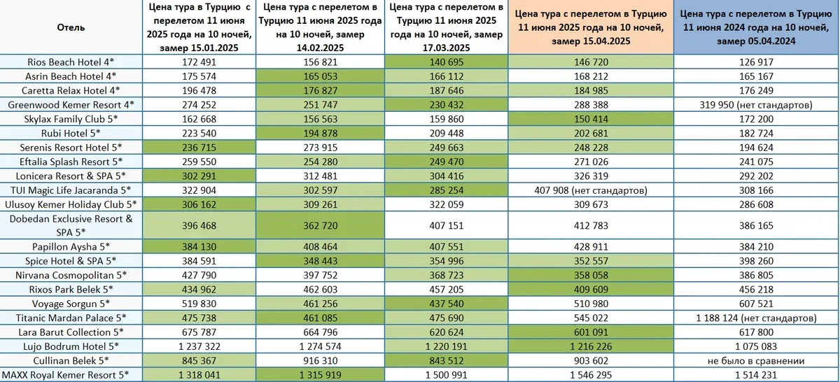 А также сравнила их с замерами цен на аналогичные турпакеты в те же отели на эту же дату в апреле прошлого года и в январе – марте 2025 года.