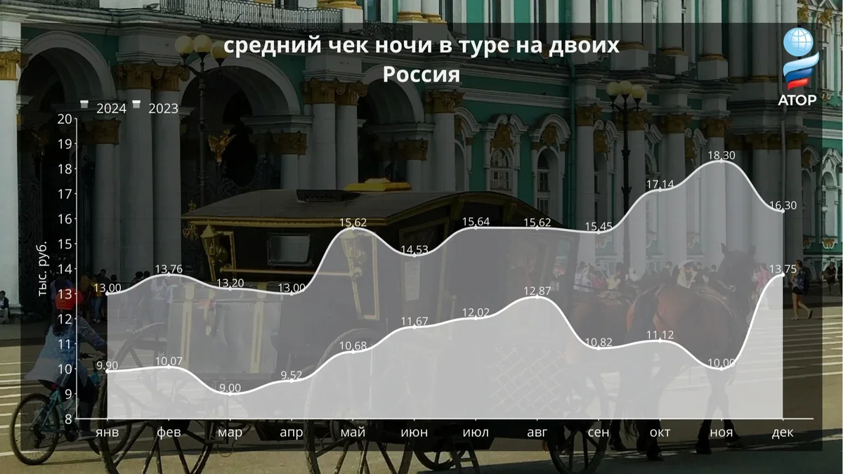 Но далее картина аномальна. В октябре и особенно в ноябре средняя цена ночи в турах по России почему-то достигает максимумов за год – хотя сезон уже не пляжный, и весь спрос сосредоточен в экскурсионных сити-турах, санаторном сегменте и в сегменте загородных отелей. В 2023 году такой странной динамики не наблюдалось (осенние средние цены, как и полагается, были ниже, а не выше летних). Показательно и то, что средняя цена ночи в туре по России в декабре 2024 года на четверть выше январской, то есть рост цен за год имеет почти линейный характер.