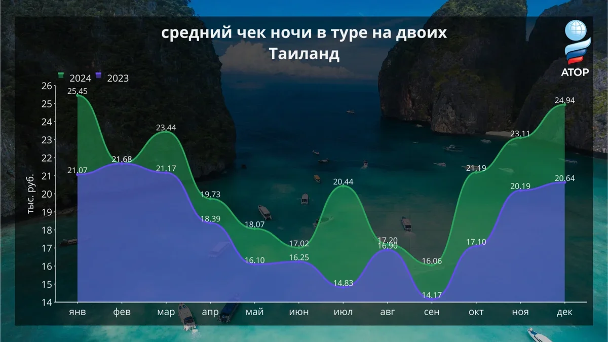 Таиланд: в среднем рост стоимости одной ночи в туре за год составил 14-20%. Исключения – почти не подорожавшие (2-4%) июнь и август, а также рекордно подорожавший июль (+37,7%). Первая половина года характеризовалась небольшой разницей с 2023 годом – 7-10%, а февральские средние цены и вовсе были почти одинаковы в 2023 и 2024 годах.