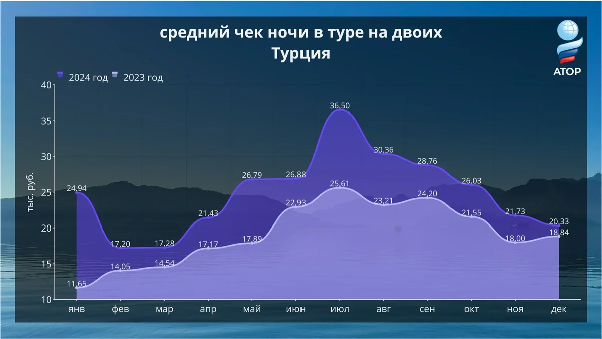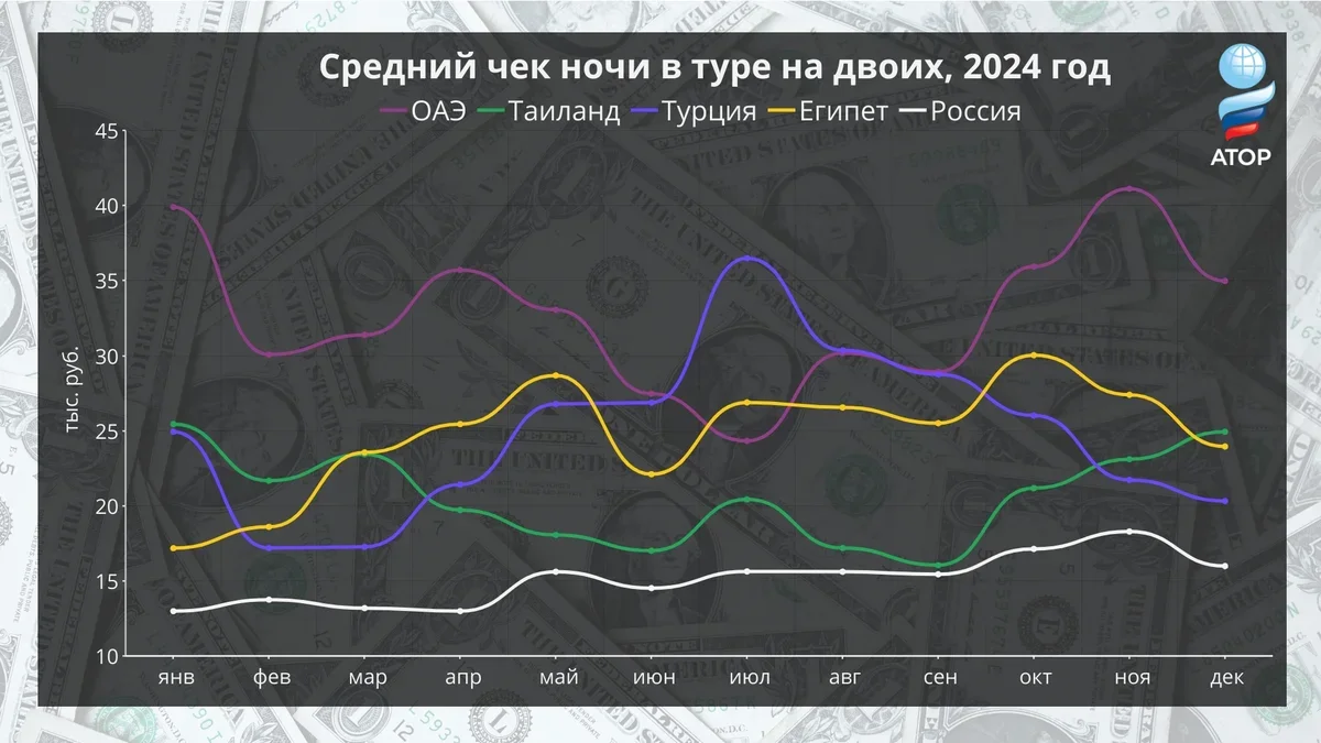 Аналитическая служба АТОР провела исследование динамики цен на пакетные туры по 5 наиболее популярным массовым туристическим направлениям 2024 года, основанное на данных, предоставленных системой поиска и бронирования туров «Слетать.ру». Были проанализированы данные о средних чеках туров за 2024 год (помесячно, январь-декабрь) и за 2023 год, а также средняя длительность туров.