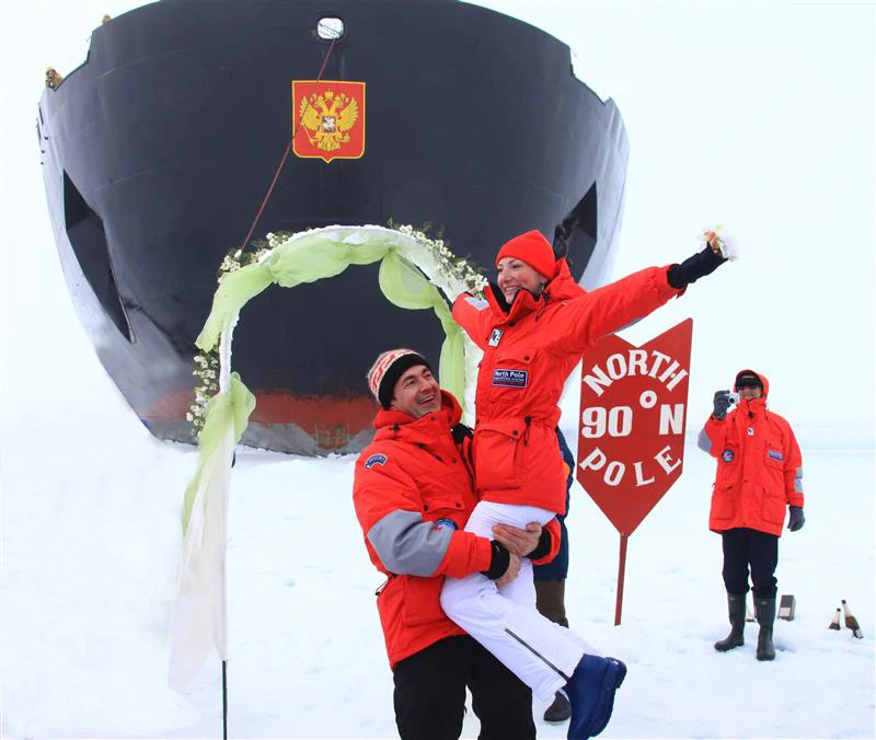 Клуб полярных путешествий предлагает пакет услуг для организации символической свадебной церемонии в круизе на Северный полюс.