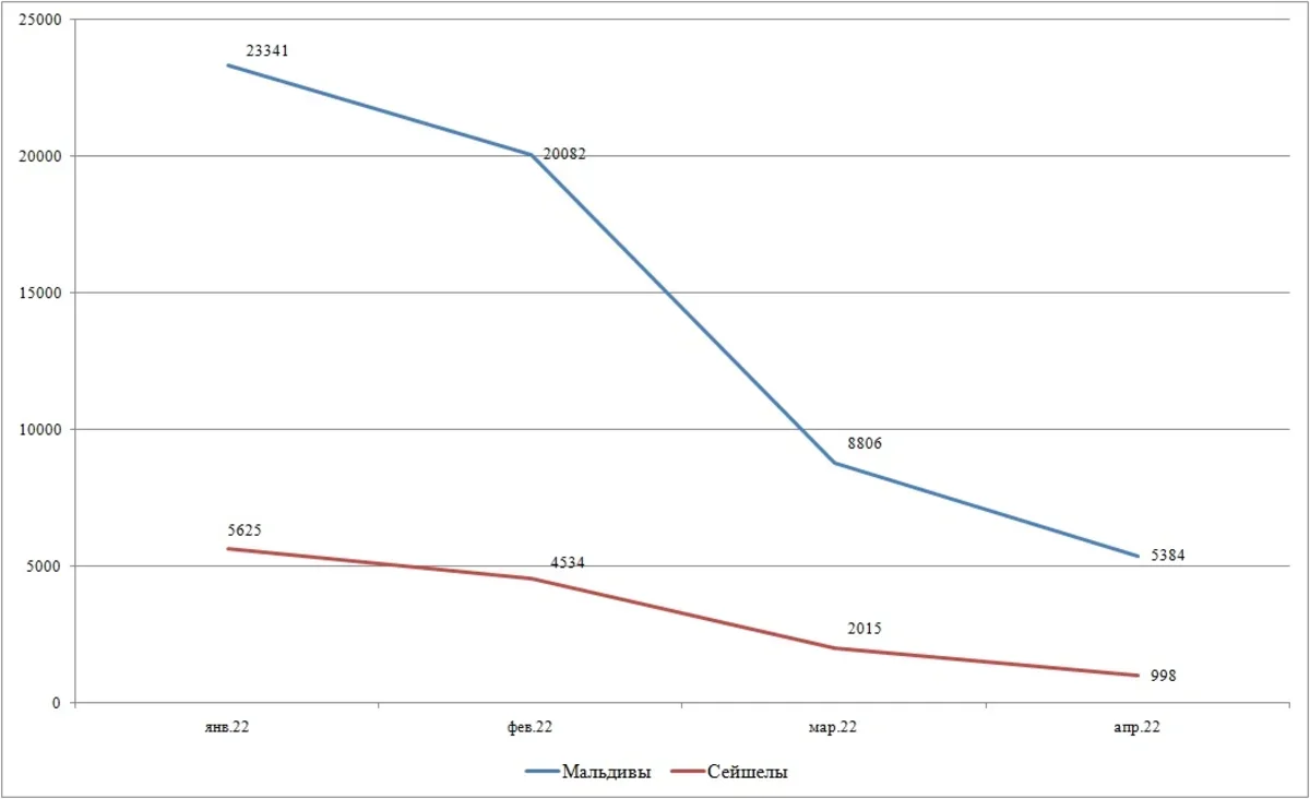 Падение турпотока из РФ на Сейшелы в марте и апреле было схожим по динамике с Мальдивами. В марте на Сейшельские острова прибыли в 2,8 раз меньше туристов из России, чем в январе, а в апреле – в 5,63 раза меньше (см. рис. 1).