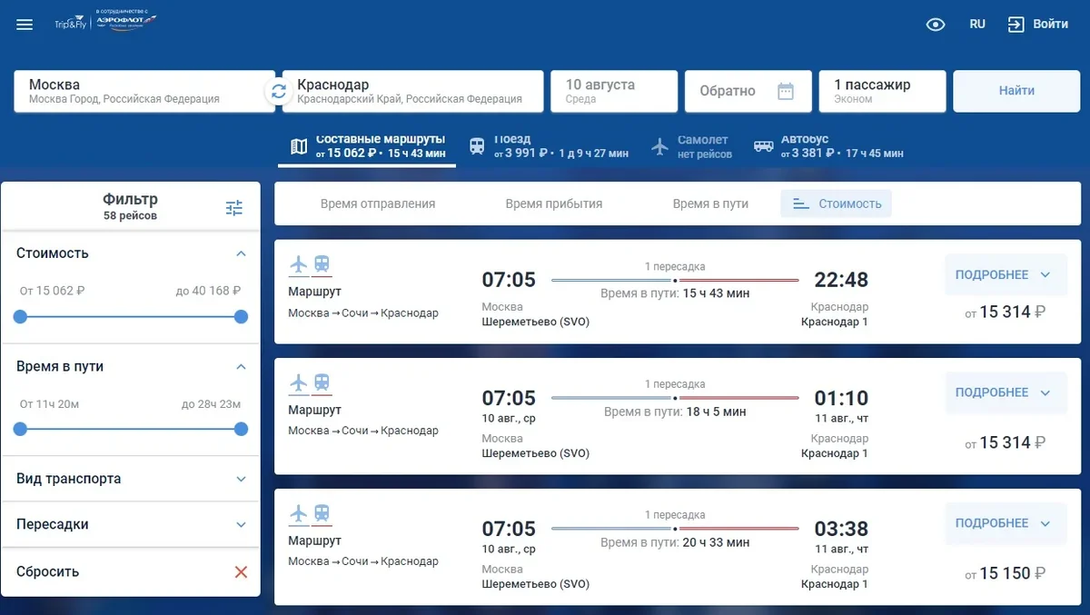 Если рассмотреть вариант покупки билета с комбинированной перевозкой из Москвы в Анапу на 5 августа, то система предложит несколько вариантов, как добраться до курорта: состыковкой в Сочи, Волгограде, Минеральных Водах или Владикавказе с дальнейшей пересадкой на поезд или автобус.