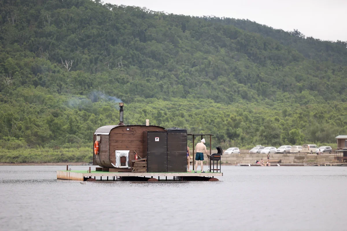 Практически по всему периметру бухты Рында расположились кемпинги и небольшие деревянные домики для отдыха на воде. В бухте почти нет волн и вода чуть теплее. Кто-то приезжает просто искупаться или пожить на берегу в палатке, но самое интересное здесь – это плавучие бани, расположенные на понтонах посреди бухты.