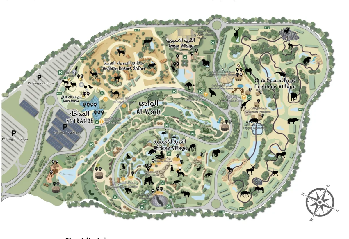 Сам парк, который занимает 119 гектар, делится на несколько частей. Здесь имеются 3 климатические зоны – арабская деревня, азиатская деревня, африканская деревня,а также деревня исследователей (сафари-зона).