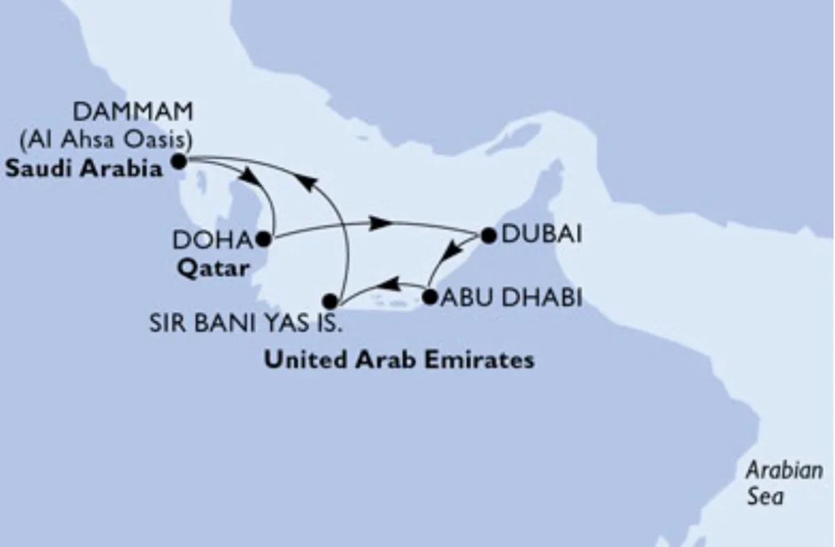 Маршрут 7-дневной программы в Персидском Заливе включает Дубай (ОАЭ), Абу-Даби (ОАЭ), Сир-Бани-Яс (ОАЭ), Даммам (Саудовская Аравия), Доха (Катар).