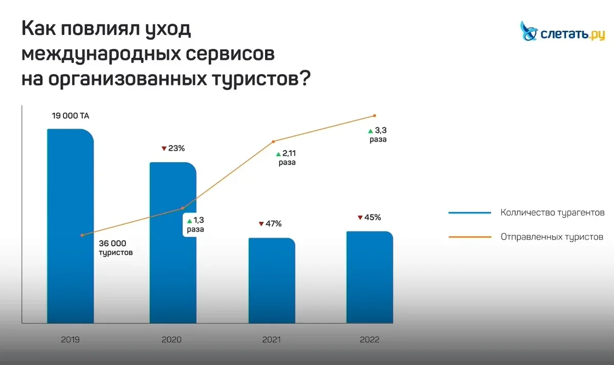 В 2022 году при том, что количество подключенных к сервису турагентств незначительно выросло (45% по отношению к уровню 2019 года), наблюдается самый значительный пик бронирований туров по России: рост количества туристов в турах по России в 3,3 раза по сравнению с доковидным периодом. Евгений Данилович связывает такой рост прежде всего с уходом Booking.com из России, который давал до 90% бронирований большинству российских отелей.